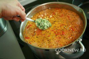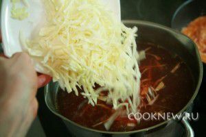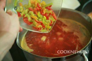 Когда борщ почти готов, посолите и поперчите по вкусу. Если картошка уже готова, то пора добавлять зажарку и наш соус. Даем борщу настояться 10-15 мин