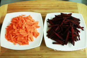 Пока варится бульон, мы готовим заправку. Нарезаем свеклу и морковь соломкой. Добавляем в бульон.