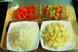 Нарезаем кубиками картофель и помидоры, перец. Небольшое количество капусту шинкуем.