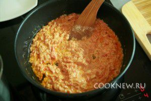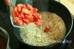 Зажарка- на небольшом количестве подсолнечного масла обжариваем лук. Когда лук дозреет, добавляем туда помидоры. Продолжаем тушить на небольшом огне