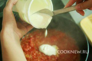 Добавляем в зажарку сметану и тщательно перемешиваем, продолжая тушить