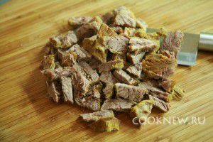 Оставляем зажарку тушится до тех пор, пока не испарится вся сметана. Мясо достаем из бульона. Даем время остыть. Нарезаем средними кубиками, очищаем от костей, если они имеются. Возвращаем в бульон уже нарезанное мясо