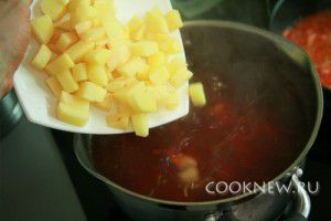 Закидываем в кипящий бульон картофель. Морковь и свекла уже придали цвет.