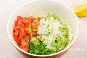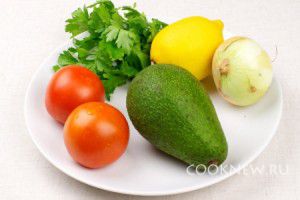 Измельчить овощи. Петрушку и репчатый лук порезать мелко. Смешать все овощи: помидоры с авокадо, лук и петрушку. В овощную массу добавить сок, выжатый из половинки лимона. Еще раз все хорошо перемешать, по вкусу добавить соль
