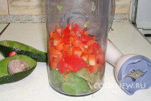 Спелое авокадо разрезать вдоль на половинки и вынуть большую косточку. Затем ложкой вынуть мякоть и положить ее в блендер к помидорам