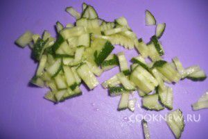 Мелко нарезать свежий огурец. Очень важно нарезать его действительно мелко, чтобы он не выделялся на фоне других ингредиентов. Так стоит отметить, что если огурец попался с жесткой кожурой, ее лучше снять