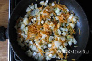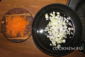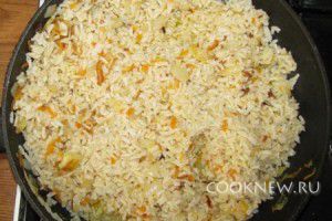 Сковородку ставим на средний огонь, наливаем подсолнечной масло и обжариваем лук и морковь около пяти минут. Добавляем затем в овощную смесь рис (без жидкости) и обжариваем его до такого состояния, чтобы он стал полностью готовым