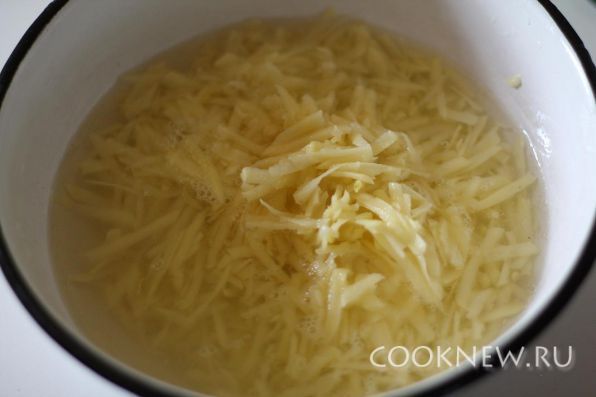 Тёртую картошку залить холодной водой и промыть от крахмала. Повторить процедуру дважды. Обычно двух раз достаточно, чтобы картошка хорошо промылась и вода стала прозрачной.