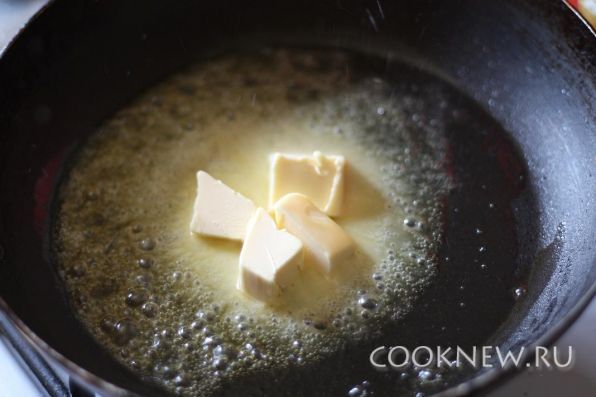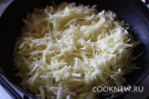 В небольшой сковородке разогреть сливочное масло и всыпать тёртый картофель