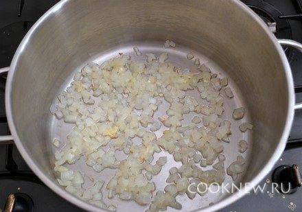 В большую кастрюлю с толстым дном налить растительное масло. Обжарить лук в течение 5 минут, до прозрачности