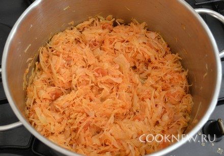 Добавить капусту, перемешать. Жарить на среднем огне под крышкой 20 минут (при необходимости можно подлить немного воды).