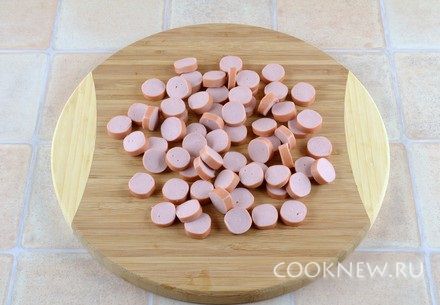 С сосисок снять оболочку, порезать кружочками шириной полсантиметра.