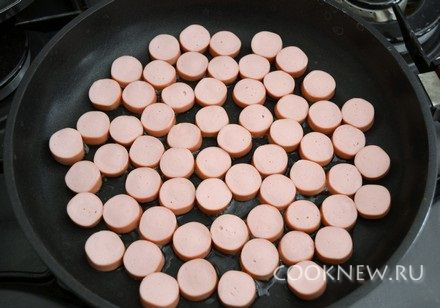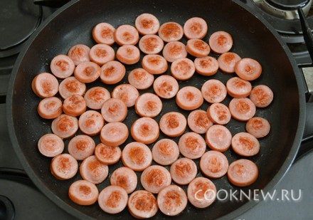 На сковороду налить немного растительного масла. Выложить кружочки сосисок, жарить 5-7 минут до легкого поджаривания с нижней стороны. Придавливать их широкой лопаткой, чтобы кружочки равномернее зажарились.