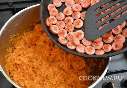 Добавить сосиски к тушеной капусте, хорошо перемешать. Выключить огонь.