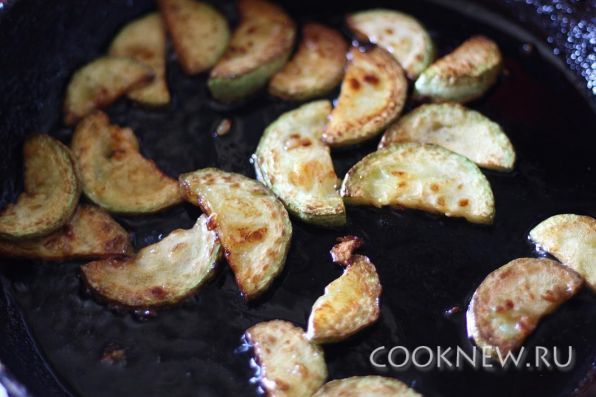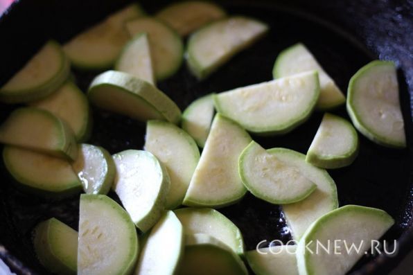 Молодые кабачки помыть нарезать полукруглыми кусочками. Чистить молодую кожицу не нужно – в обжаренном виде кусочки будут меньше разваливаться. Обжарить кусочки кабачков в масле с двух сторон.