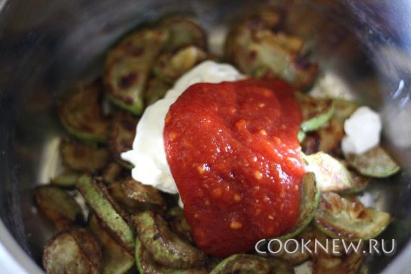 Теперь добавляем по ложке сметаны и томатного соуса.