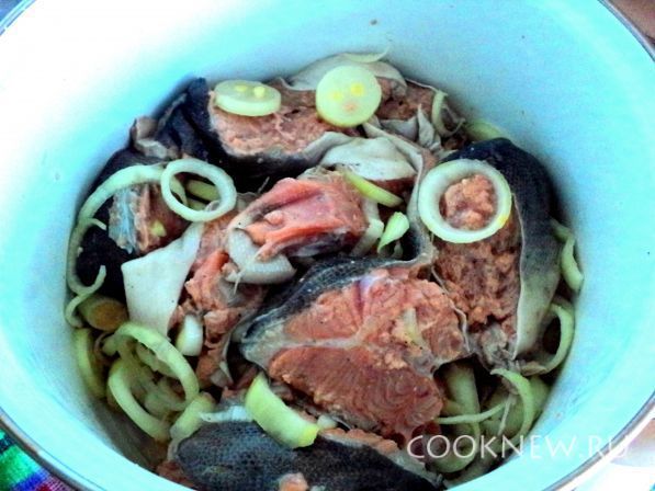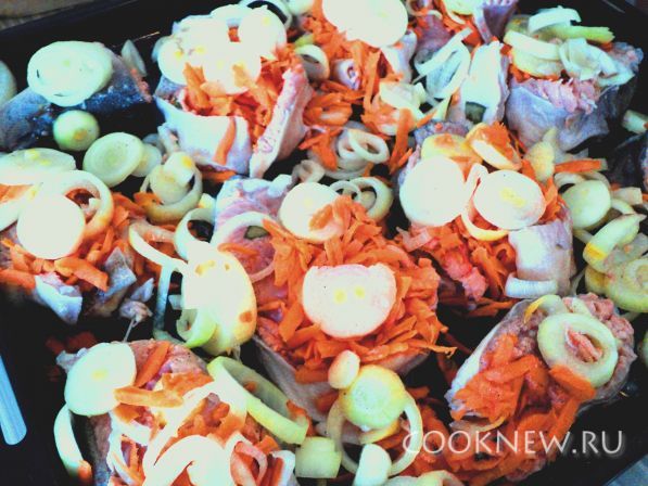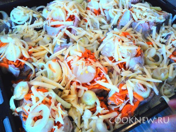 Рыбу выкладываем так, чтобы куски не касались друг друга. Лук из маринада выкладываем поверх рыбы, добавляем тертую морковку