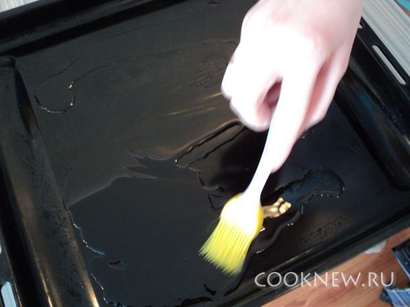 Далее берем противень и смазываем его растительным маслом
