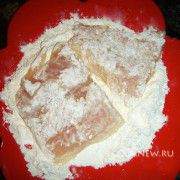 Муку высыпать на плоскую тарелку. Обвалять рыбные ломтики в муке с обеих сторон и выложить на сковородку с разогретым растительным маслом.