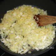 Репчатый лук и чеснок почистить. Лук нарезать небольшими кубиками, чеснок нарезать чуть поменьше размером. В отдельной сковороде на небольшом огне обжарить чеснок с луком до солнечного цвета или до полупрозрачности (примерно 1-2 минуты).