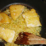К жареному луку с чесноком на сковородку выложить поджаренное рыбное филе