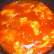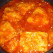 Следом за рыбой выложить томатную пасту, слегка разбавленную водой (1 стакан). Рыбка должна быть полностью покрыта этой смесью