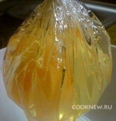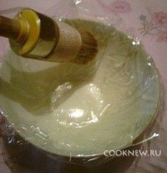 Из рукава для запекания нам нужно сделать пищевую термопленку - для этого просто отрезаем куски рукава длиной см 40, потом с одной стороны разрезаем, чтобы получился просто прямоугольник. Выстилаем миску пленкой и кисточкой смазываем обильно оливковым маслом