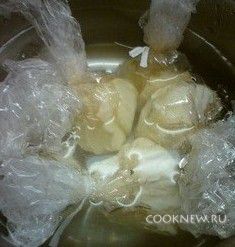 Бросаем наши мешочки в кипящую воду. Надо, чтобы они свободно плавали. Огонь уменьшаем до такого, чтобы оставалось свободное кипение (пузырьками), но без бурления. Варим ориентировочно минуты 4
