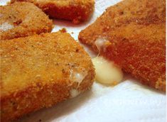 Наливаем на сковороду на средний огонь масло. Каждый кусочек сыра окунаем сначала во взбитое яйцо, затем в панировочные сухари и сразу же обжариваем.