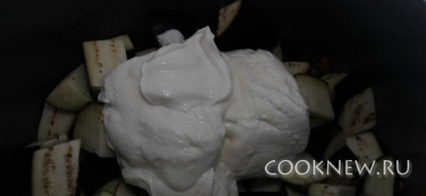 В мультиварку добавьте сметану, перемешайте и установите режим «Выпечка» на 1 час. В ходе приготовления баклажаны в мультиварке можно 1-2 раза перемешать.