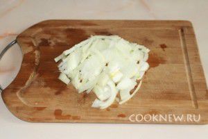 Нарежьте репчатый лук полукольцами, затем разрежьте полукольца пополам.