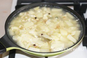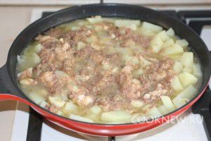 Когда лук станет золотистого оттенка, выложите к нему картошку. Влейте 2 стакана воды. Она должна покрывать содержимое сковороды как показано на фото. Перемешайте и убавьте огонь. Тушите блюдо, накрыв крышкой, около 10 минут до полуготовности картофеля. Положите лавровый лист. Также можно добавить перец горошком
