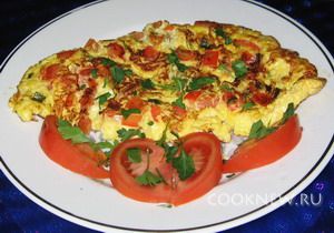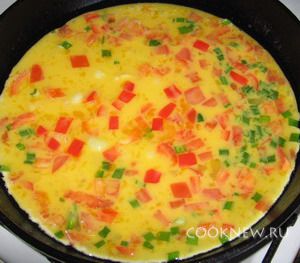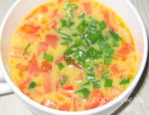 Яйца взбиваем с молоком, добавляем в смесь нарезанные овощи, зелень и тертый сыр. Солим по вкусу.