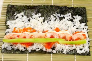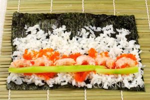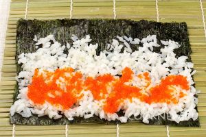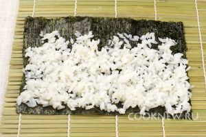 Подготовить листы нори — отрезать от каждого листа 1/3 часть (использовать будем большую часть). Выложить на макису нори и распределить рис тонким слоем на листе нори.