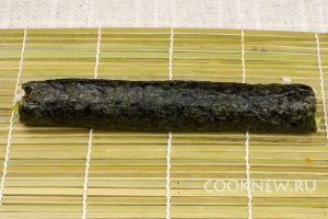 Аккуратно и плотно свернуть ролл. Готовый ролл оставить полежать на 7-10 минут швом вниз (из указанного количества продуктов получается 6-7 роллов).Разрезать на порции.