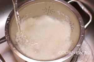 300 грамм риса хорошо промыть в проточной воде, чтобы смываемая вода стала прозрачной.