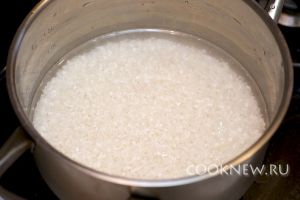 Залить рис 350 мл холодной воды и не закрывая крышки на большом огне довести до кипения