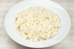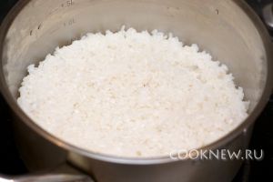 В готовый горячий рис добавить заправку, хорошо перемешать и дать рису остыть.