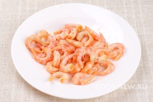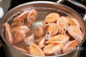 Креветки промыть под прохладной водой. В кастрюле довести до кипения воду, добавить 1-2 чайные ложки соли (вода должна быть хорошо подсоленной) и сок половины лимона. Затем выложить в воду креветки и варить 5-7 минут с момента закипания.