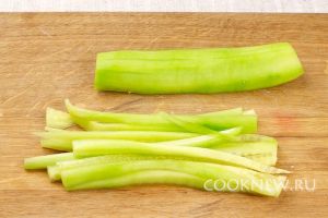 Огурец помыть, очистить от кожуры и нарезать тонкими полосками.