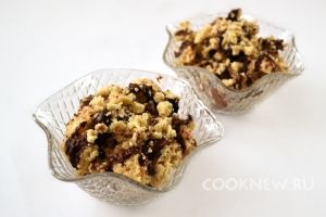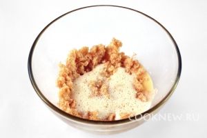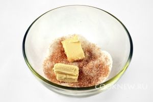 Смешиваем белый и коричневый сахар и перетираем с размягчённым сливочным маслом до состояния крошки