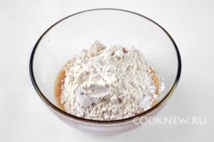 Муку смешиваем с солью и разрыхлителем и всыпаем в жидкую смесь, замешиваем тесто
