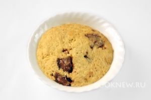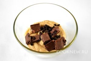 В конце добавляем шоколад, разломанный на квадратики, и шоколадные капли, перемешиваем