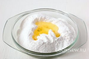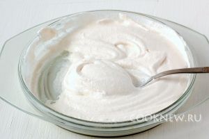 Тщательно растереть. Не взбивать, а втирать белок в пудру. Сначала будет достаточно жидкая масса