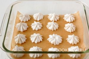 Выложить небольшие безешки с помощью кулинарного шприца или чайной ложки в форму для запекания в микроволновке на кулинарную бумагу. Между безешками надо оставить расстояние