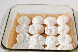 Выпекать в микроволновке 1 минуту при мощности 750 Вт. Безе при выпечка немного растечется — это нормально. В центре микроволновка выпекает сильнее и поэтому если не хотите немножко пересушенного безе в центре — не выкладывайте туда безе.