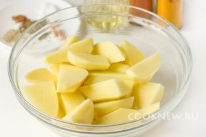 Картофель чистим, моем, нарезаем крупными ломтиками-дольками, тщательно просушиваем их бумажным полотенцем