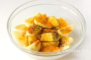 Добавляем к картофелю подсолнечное рафинированное масло, морскую соль, молотый мускатный орех, сухой тимьян, молотую паприку, куркуму