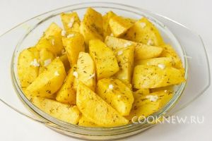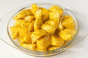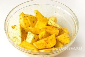 Тщательно перемешиваем руками, чтобы каждый кусочек картофеля был покрыт маслом и пряностями
