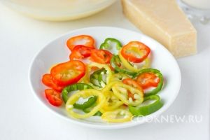 Перец чистим от семян и внутренних перегородок, нарезаем тонкими кольцами